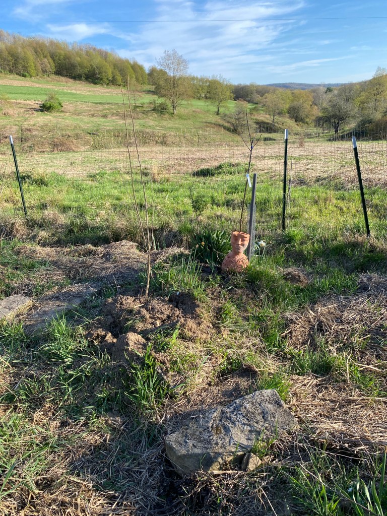 The life I choose to add to the project is not random. Just like the biochar, each component has a job to do. Also, the plants tell a story about this place and my life in this place. My story is not unique and the affiliation with these plants is also not unique. The plants are also chosen because of their place in the big picture. The elderberry’s deep purple berries and sweet smell draw in small children and birds. The birds drop seeds further than the elderberry tree can reach. The birds feed the soil, and the branches also shade the soil and allow thirsty young plants to thrive in the shade. It in turn nestles back up against a strong oak who she shares their wealth with. He holds strong against the cold winds and hard rains protecting her protected from the elements. All living together in harmony or least in my imagination.