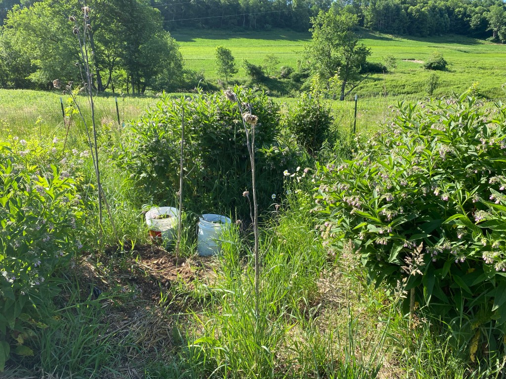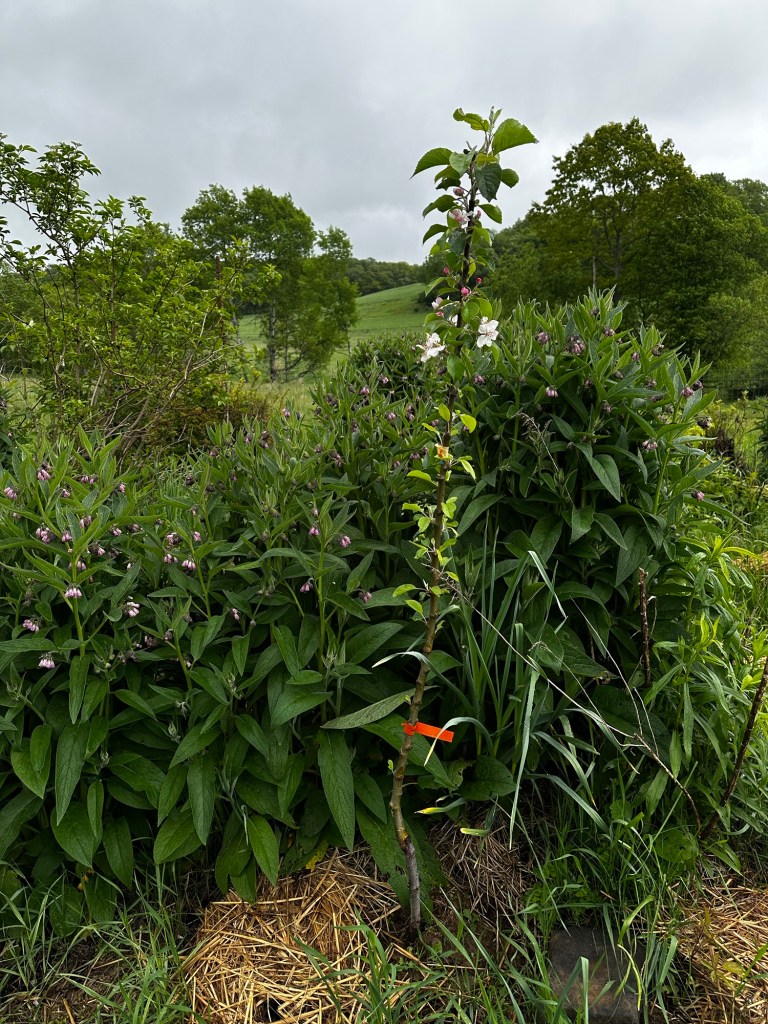 The final element and medium of this project are my companion species that are planted and welcomed to the site. Life is the fifth element and the material that is the future of my manifestation. A future of abundance for future generations of myself and these co-creators. The living elements will live in symbiosis and thrive. Life is tenacious and delicate all in one breath. Recent science and studying of others allow me to grasp concepts and species interaction that until recently I had very little knowledge of. These unseen yeasts in the belly of a wasp directing it to the flower to sip from because the flower called to it is amazing and wonderous. Science has given us a lens to miracles and unseen beauty. The data from my own soil test let me know that the soil under my floundering apple is because a cooper and zinc soil deficiency. This led me to the knowledge of a discovery of ancient biochar found in the amazon that would allow me to recreate to amend the soil with chicken manure and charcoal.